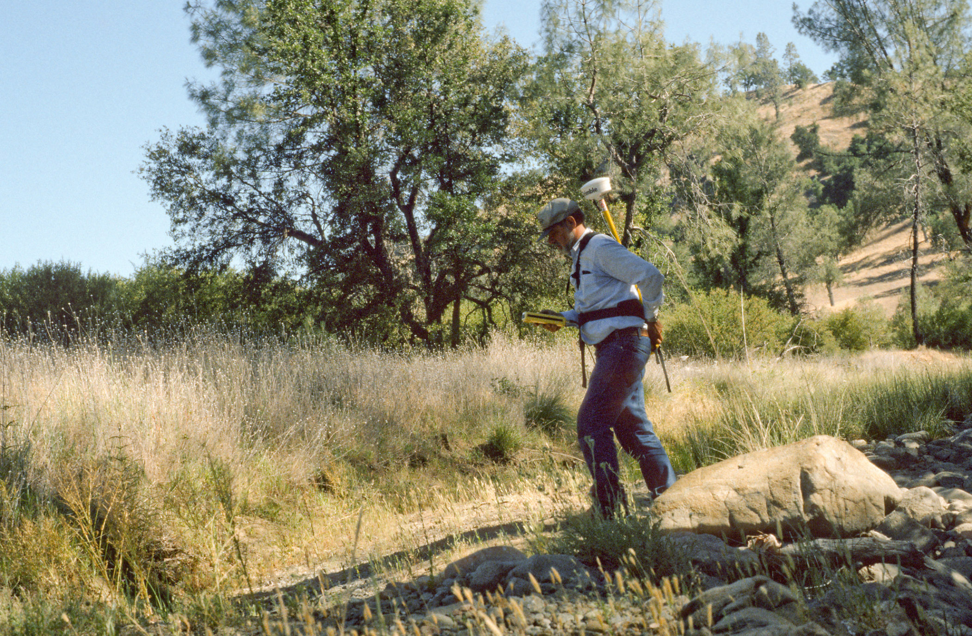 Dieter Wilken mapping rare plants with backpack GPS unit, Fort Hunter Liggett