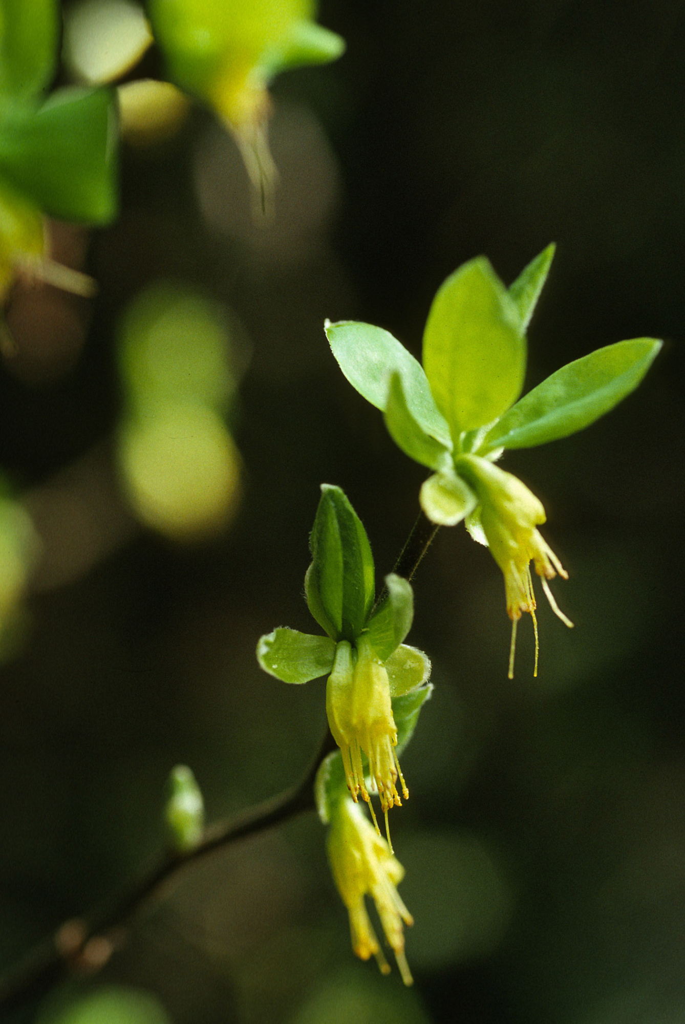 « back to search Dirca occidentalis Date July 1997 Media FormatSlide PhotographerDieter H. Wilken Location Information Country: United States Plant Information Plant(s) Pictured Western Leatherwood (Dirca occidentalis) More Info Alternative Common NamesLeatherwood, Western, Native StatusNative Plant Type/Growth FormShrub CNPS Rare Plant Index1B.2 Blooming PeriodJan-Mar(Apr) Plant Communities Chaparral, Forest, Wetland/Riparian, Woodland, Chaparral, Closed-Cone Pine Forest, Foothill Woodland, Mixed Evergreen Forest, North Coastal Coniferous Forest, Dirca occidentalis Flower Color Yellow Primary Plant Part Flower Close-up, Leaves, Stems/Branches/Trunk General Subject General Subject Plant Pictures Subject Tags Wildflower Display Image & Format Details Decade1990s Photo OrientationPortrait Image & Format Tags Color photograph, Low-key photography Date is Processing Date Yes Index NumberSL_20795