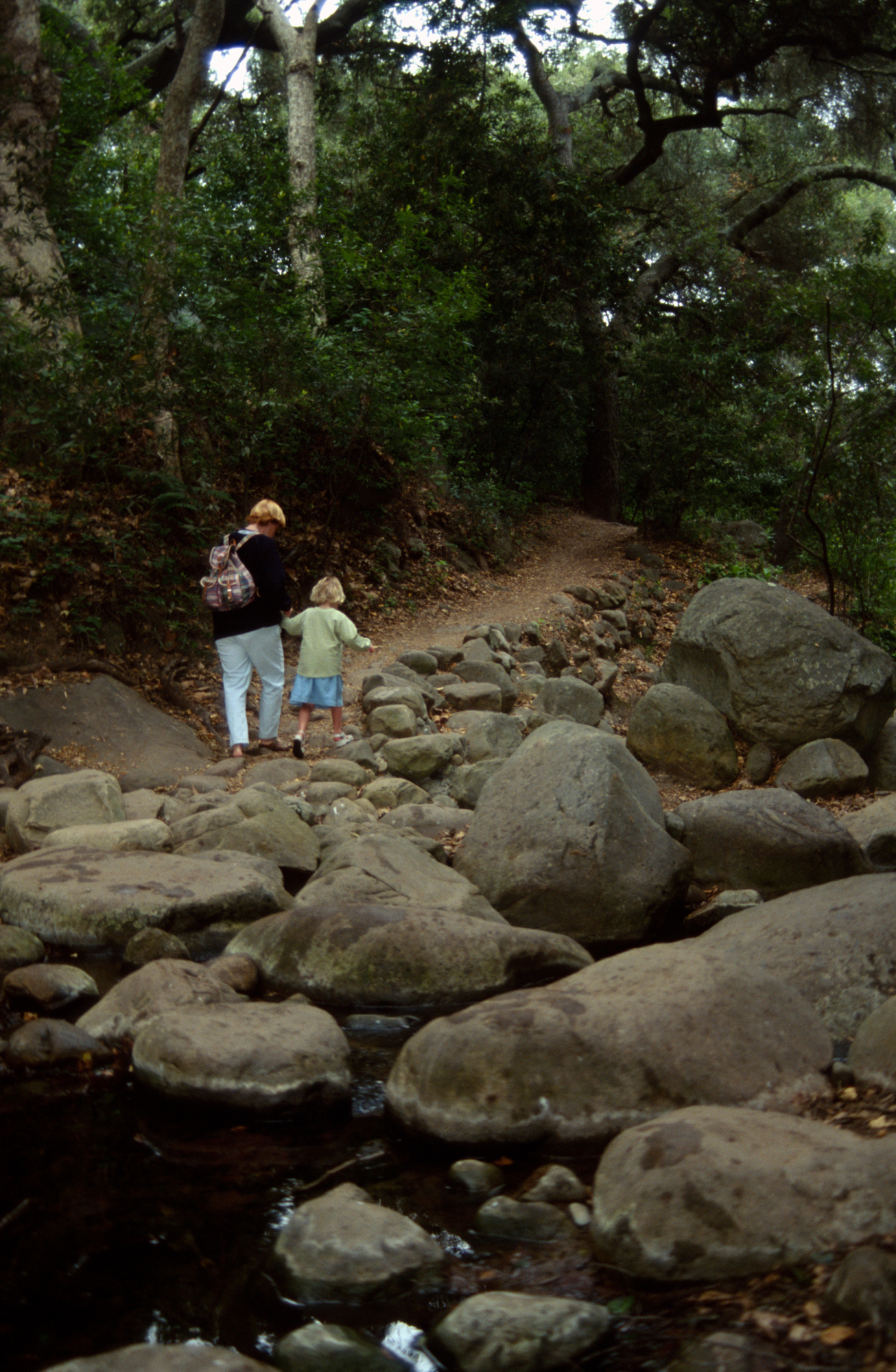 family crossing Mission Creek on boulders at creek crossing