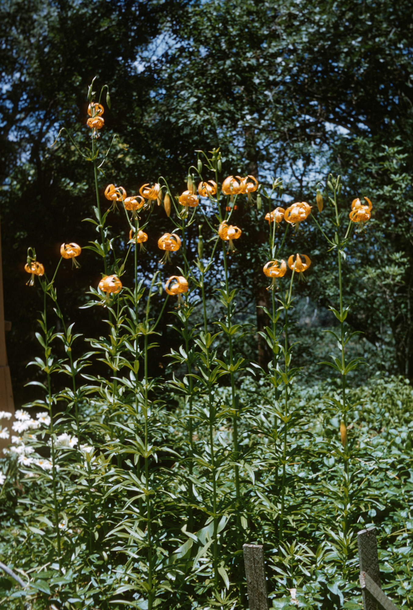 « back to search Lilium pardalinum, fragraus Date October 1962 Media FormatSlide PhotographerFrank E. Ford Location Information Plant Information Plant(s) Pictured Leopard Lily (Lilium pardalinum) More Info Alternative Common NamesLily, Tiger, California Tiger Lily, Leopard Lily Native StatusNative Plant Type/Growth Formperennial herb Blooming PeriodSummer Plant Communities Forest, Wetland/Riparian, Mixed Evergreen Forest, North Coastal Coniferous Forest, Yellow Pine Forest, Lilium pardalinum Flower Color Orange, Red, Brown Primary Plant Part Inflorescense, Leaves Image & Format Details Decade1960s Photo OrientationPortrait Image & Format Tags Color photograph Collection SBBG Library Archives Index NumberSL_19780