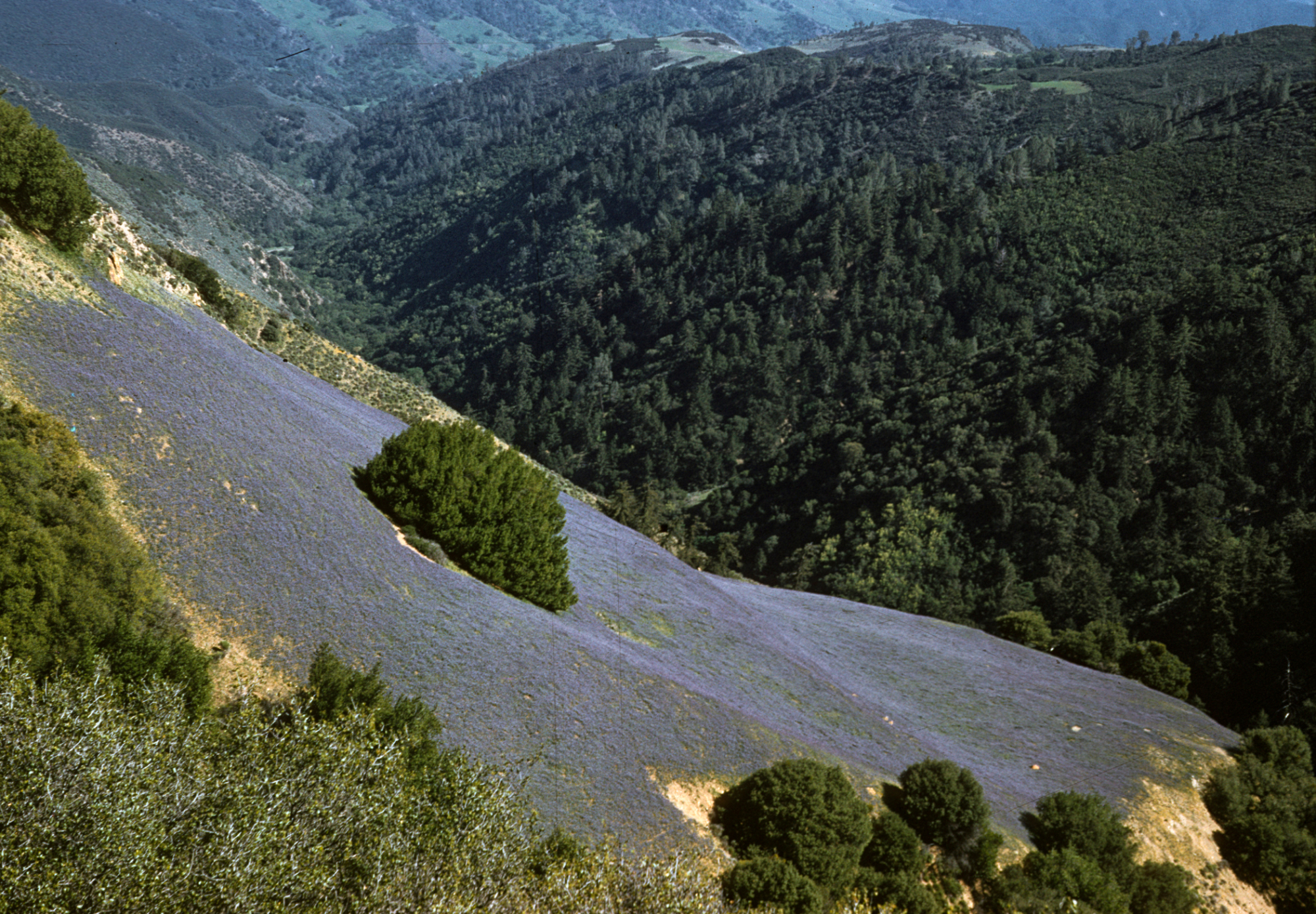 « back to search Lupinus nanus on steep hillside slope, Figueroa Mountain widlflowers Date April 1960 Media FormatSlide PhotographerKatherine K. Muller Location Information Place Name Figueroa Mountain Country: United States State: California County: Santa Barbara Plant Information Plant(s) Pictured Sky Lupine (Lupinus nanus) More Info Alternative Common NamesLupine, Sky, Valley Sky Lupine Native StatusNative Plant Type/Growth Formannual herb CultivarsYes Blooming PeriodWinter, Spring Plant Communities Lupinus nanus, Grassland, Woodland, Coastal Prairie, Coastal Sage Scrub, Foothill Woodland, Northern Coastal Scrub, Valley Grassland Flower Color Blue, Lavender Primary Plant Part Whole Plant Natural Landscapes General Habitat Chaparral General Subject Subject Tags Wildflower Display Image & Format Details Decade1960s Photo OrientationLandscape Image & Format Tags Color photograph Collection SBBG Library Archives Index NumberSL_15763