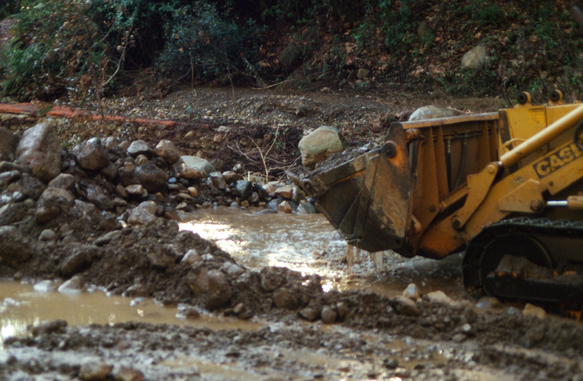 Mission Creek flooded above Mission Dam, with a bulldozer