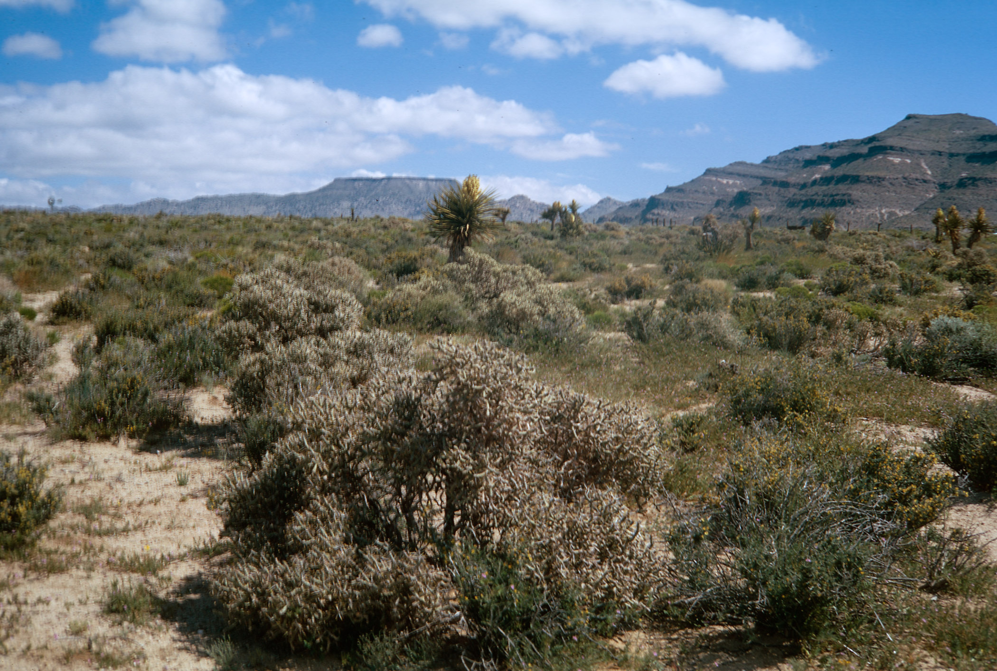 Opuntia ramosissima in foreground, Coleogyne, Yucca, etc., Providence Mountains