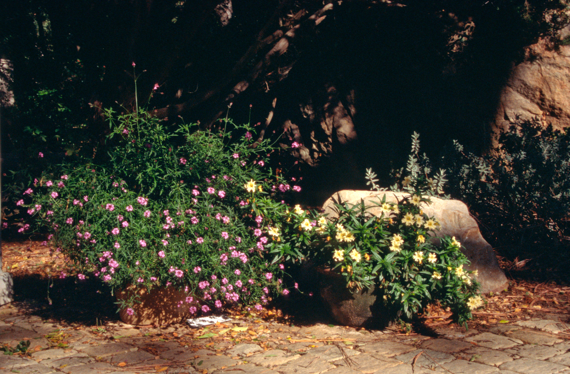 potted plants at Garden Entrance, pavered path and boulder