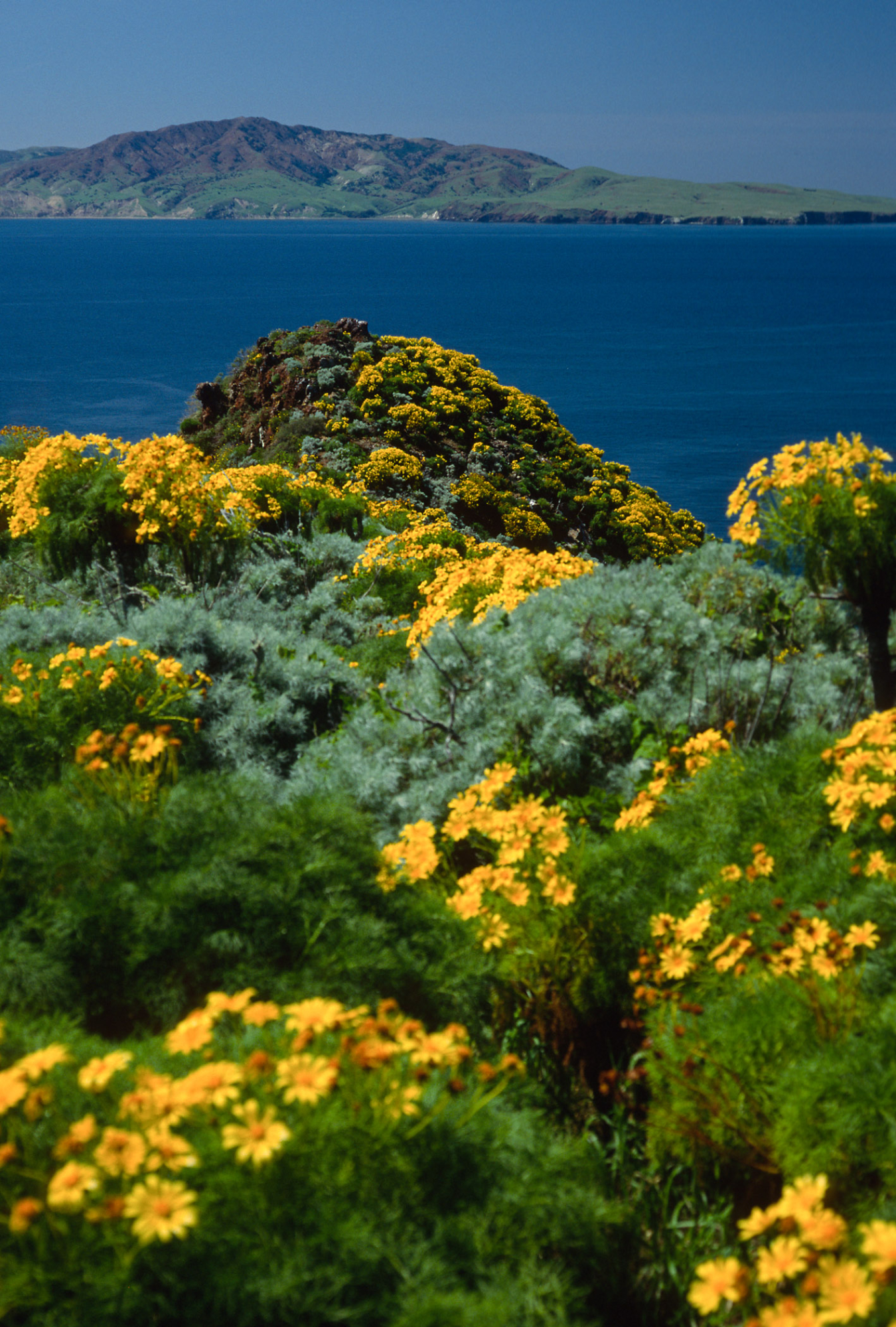 West Anacapa Island, view of Santa Cruz Island, Coreopsis