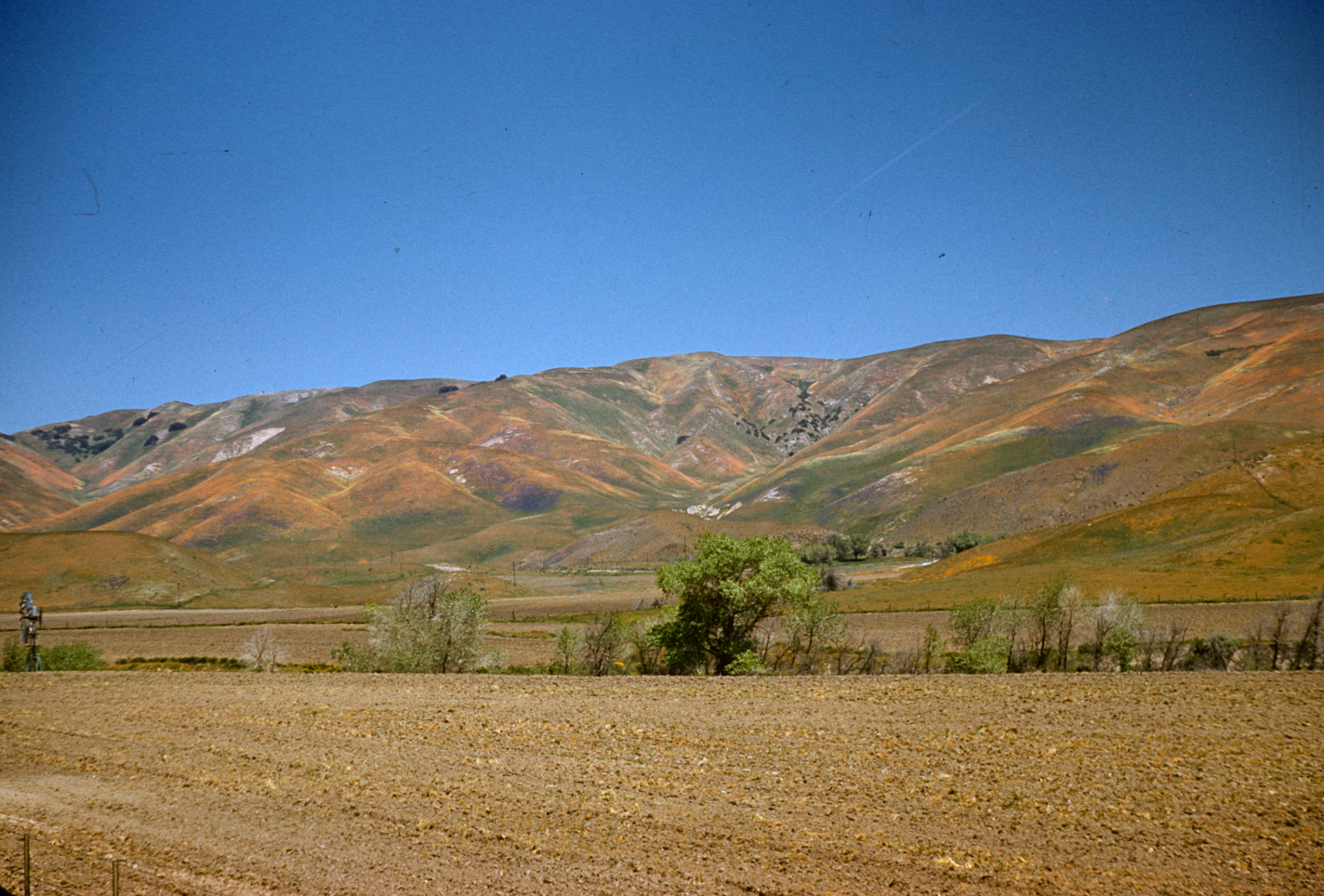 wildflowers, hills at Gorman, Gorman Hills covered with poppies, 1958